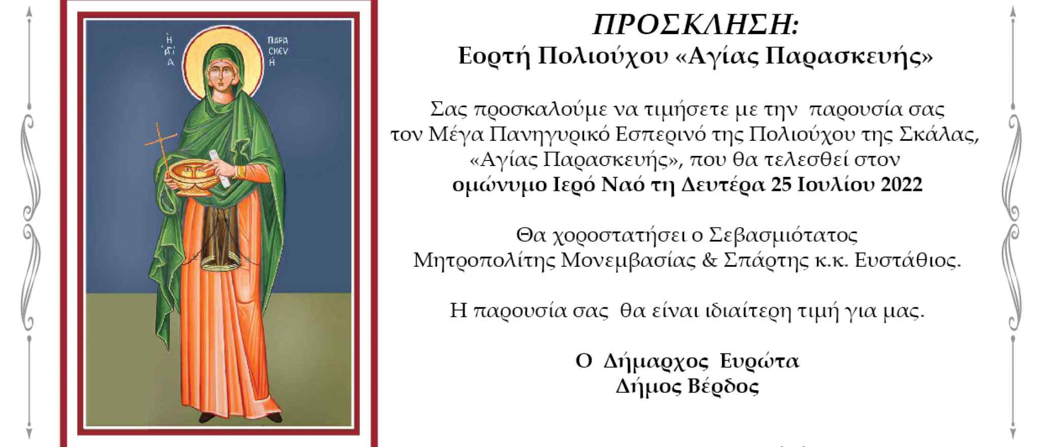 Σας προσκαλούμε να τιμήσετε με την παρουσία σας τον Μέγα Πανηγυρικό Εσπερινό της Πολιούχου της Σκάλας,