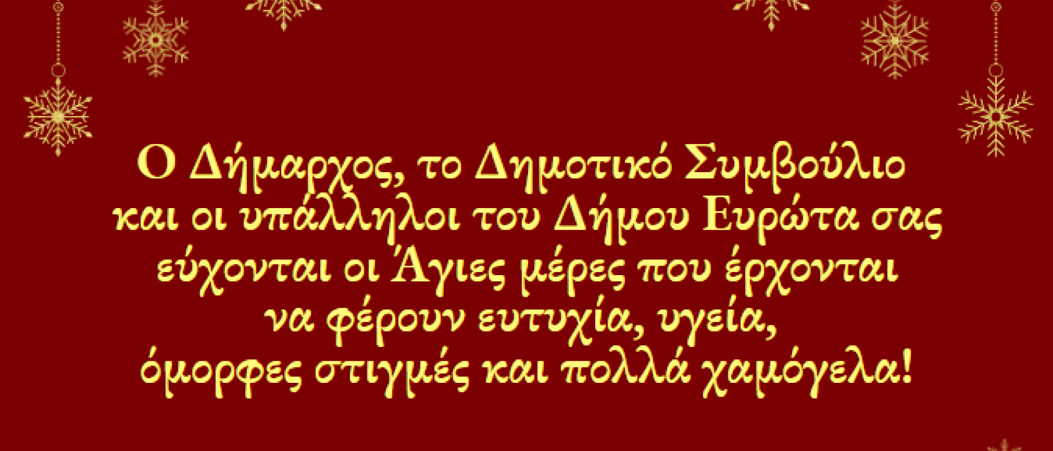 Σύμφωνα με τις τελευταίες ανακοινώσεις του Υπουργείου Υγείας και ειδικότερα τα νέα μέτρα για την αντιμετώπιση του Covid-19, ο Δήμος Ευρώτα και η Κοινωφελής Δημοτική Επιχείρηση «Ευρώτειος Πολιτεία» ανακοινώνουν την ματαίωση των εορταστικών εκδηλώσεων, οι οποίες είχαν προγραμματιστεί για το διάστημα 27-29 Δεκεμβρίου 2021.