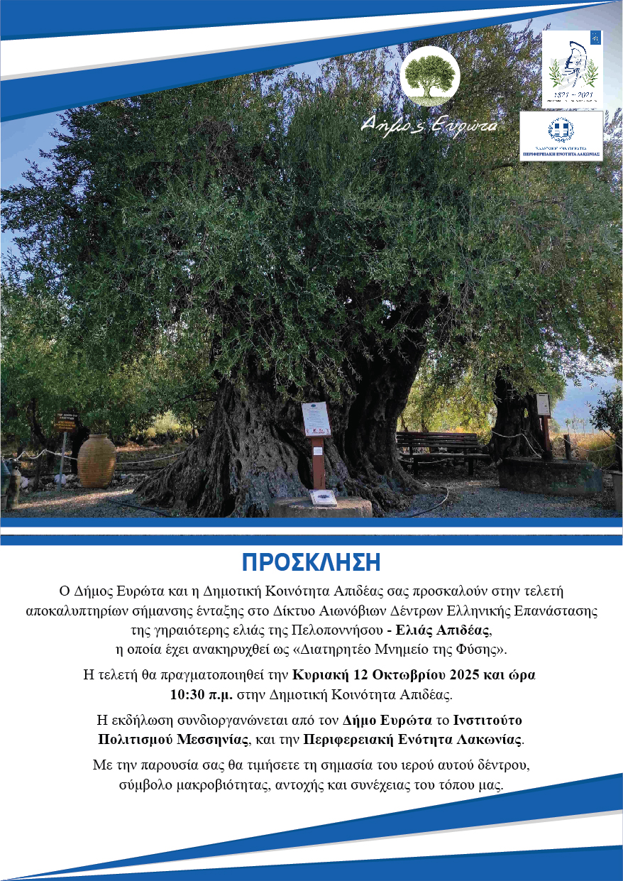 Ο Δήμος Ευρώτα και η Δημοτική Κοινότητα Απιδέας διοργανώνουν τελετή αποκαλυπτηρίων της σήμανσης ένταξης της γηραιότερης ελιάς της Πελοποννήσου – της Ελιάς Απιδέας – στο Δίκτυο Αιωνόβιων Δέντρων Ελληνικής Επανάστασης.
