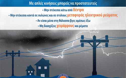 - Να αποφεύγουν τις εργασίες υπαίθρου και δραστηριότητες σε θαλάσσιες και παράκτιες περιοχές κατά τη διάρκεια εκδήλωσης των έντονων καιρικών φαινομένων (κίνδυνος από πτώσεις κεραυνών).