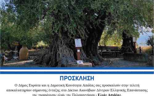 Ο Δήμος Ευρώτα και η Δημοτική Κοινότητα Απιδέας διοργανώνουν τελετή αποκαλυπτηρίων της σήμανσης ένταξης της γηραιότερης ελιάς της Πελοποννήσου – της Ελιάς Απιδέας – στο Δίκτυο Αιωνόβιων Δέντρων Ελληνικής Επανάστασης.