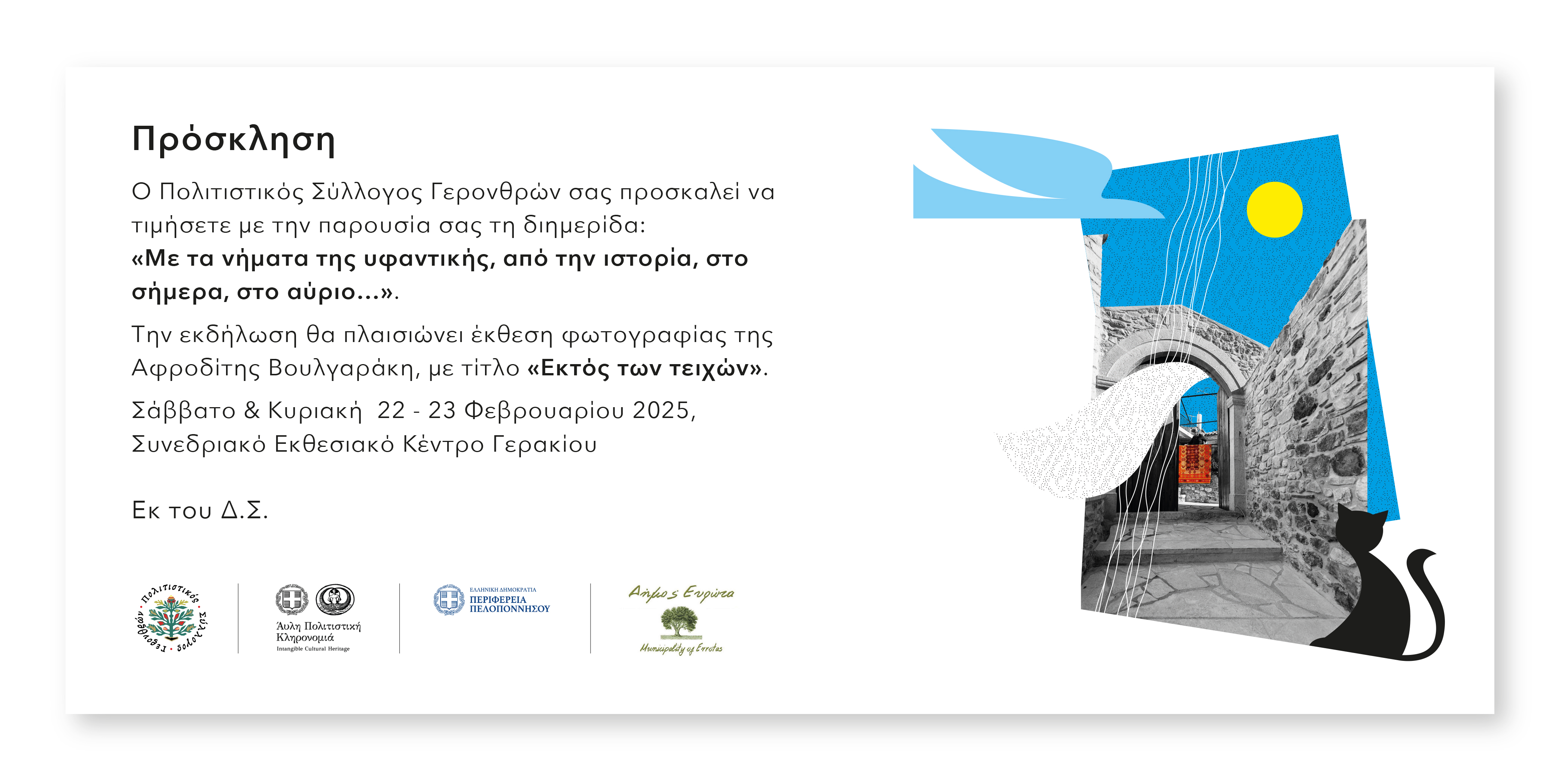 Το Σάββατο 22 και την Κυριακή 23 Φεβρουαρίου σας περιμένουμε σε ένα διήμερο, αφιερωμένο στην ιστορία, το παρόν και το μέλλον του Πολιτισμού και της Τέχνης του Γερακίου στο Συνεδριακό Εκθεσιακό Κέντρο Γερακίου ( της Ένωσης Απανταχού Γερακιτων)!!