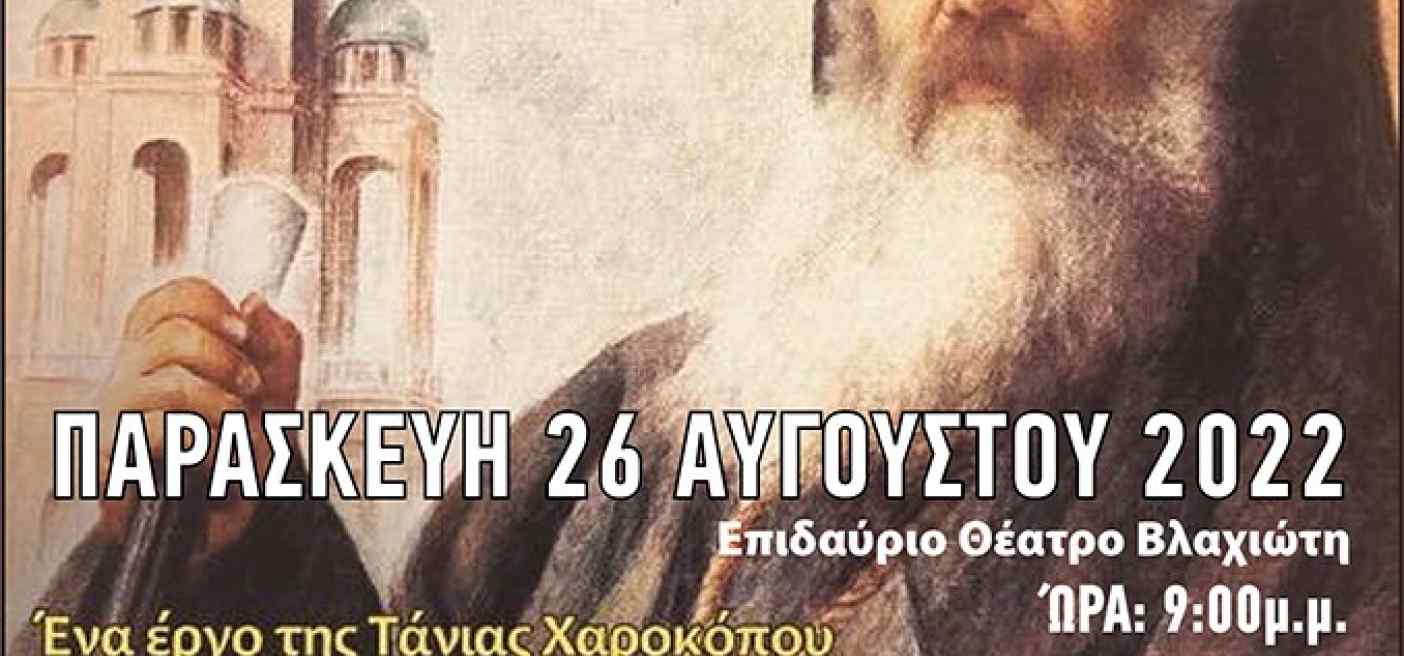 Το έργο "Χρυσόστομος Σμύρνης" της Τάνιας Χαροκόπου παρουσιάζεται απόψε στις 21:00 στο Επιδαύριο Θέατρο Βλαχιώτη, στο πλαίσιο των διήμερων εκδηλώσεων για τα 100 χρόνια από τη μικρασιατική καταστροφή.